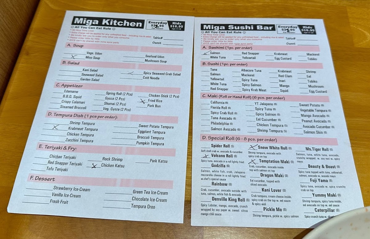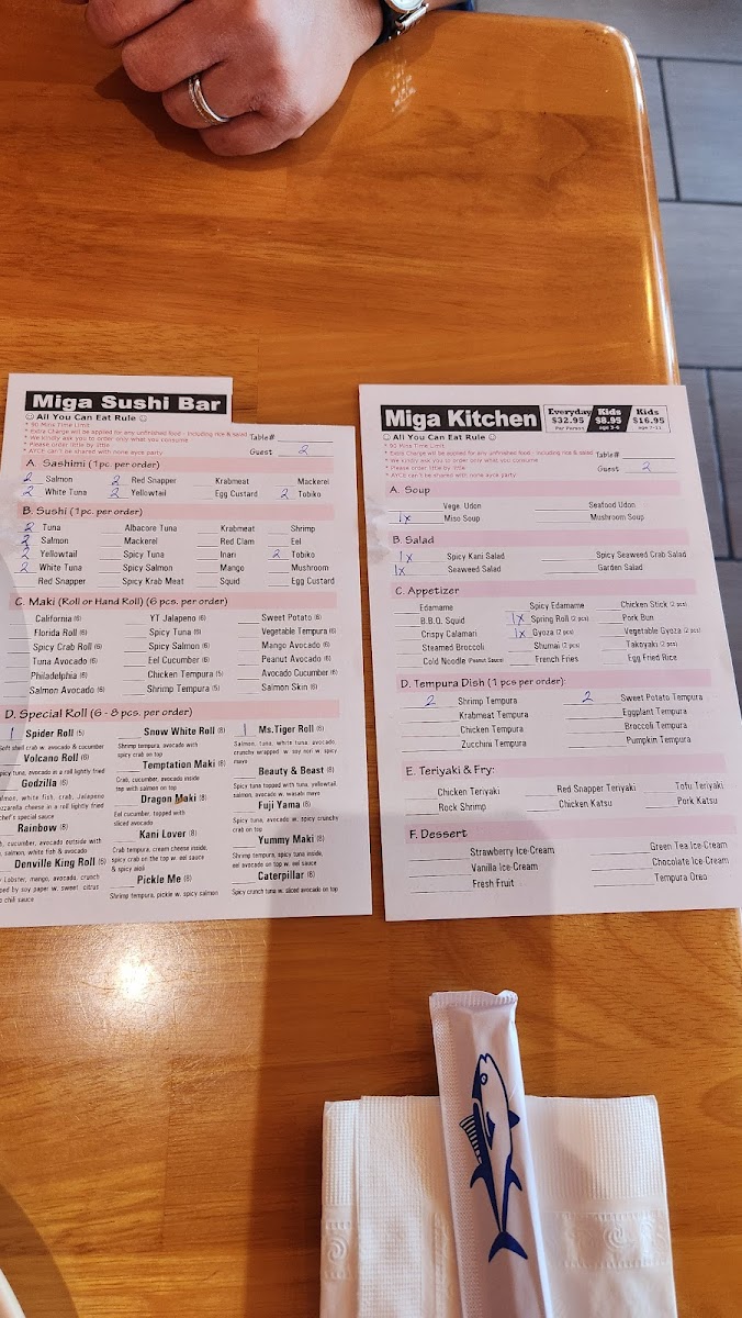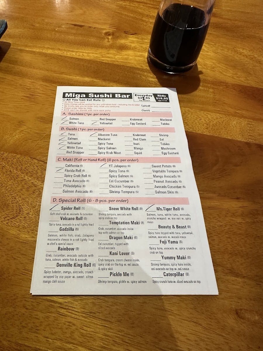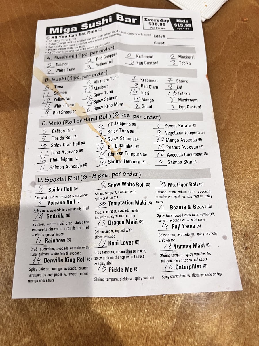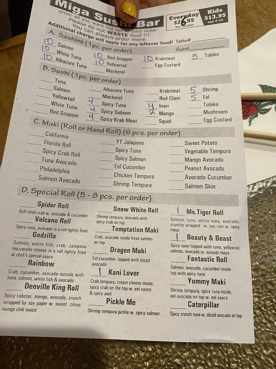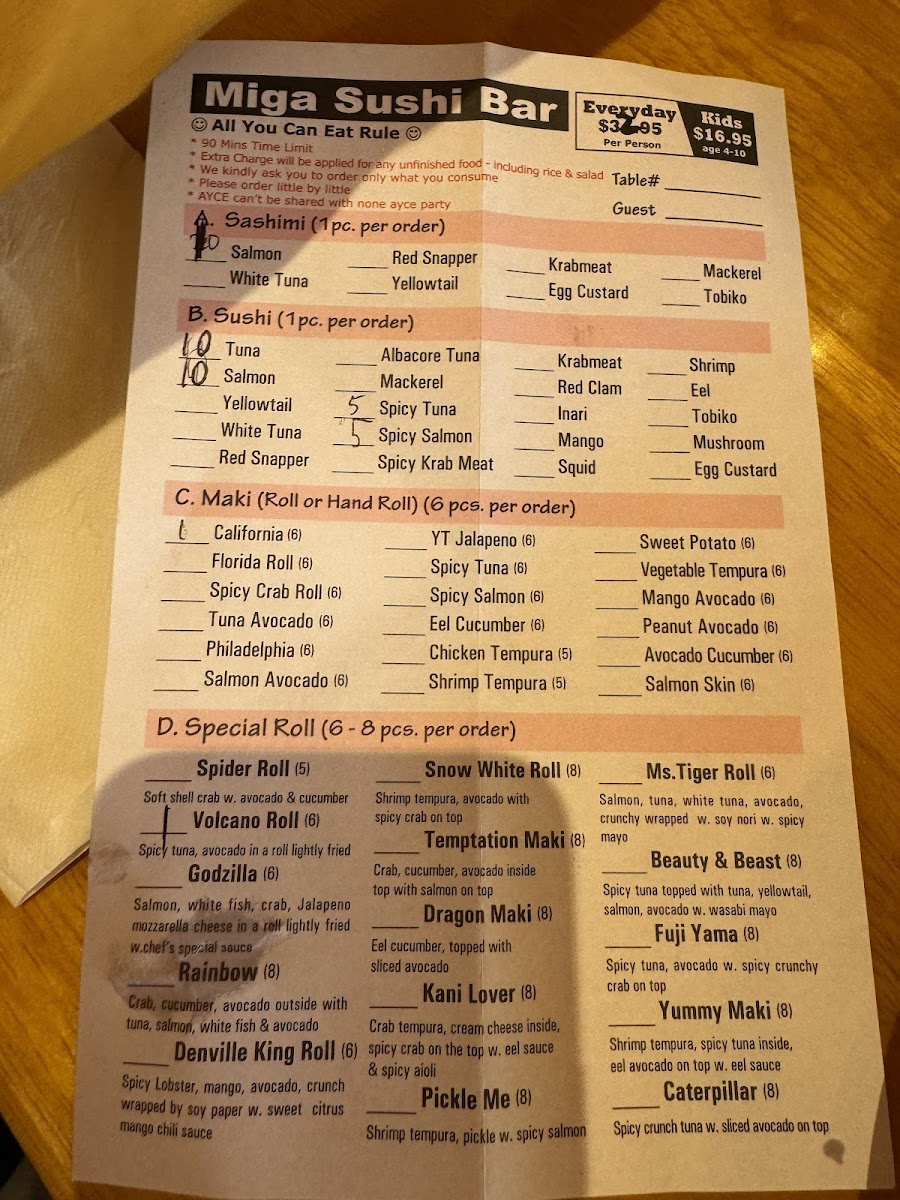 63 pieces. Signature Roll, Shrimp Tempura Roll, Beauty & Beast Roll, Sweet Potato Roll, Cucumber Roll, Tuna Roll, Spicy Salmon Roll, Spicy Tuna Roll, 2 California Roll