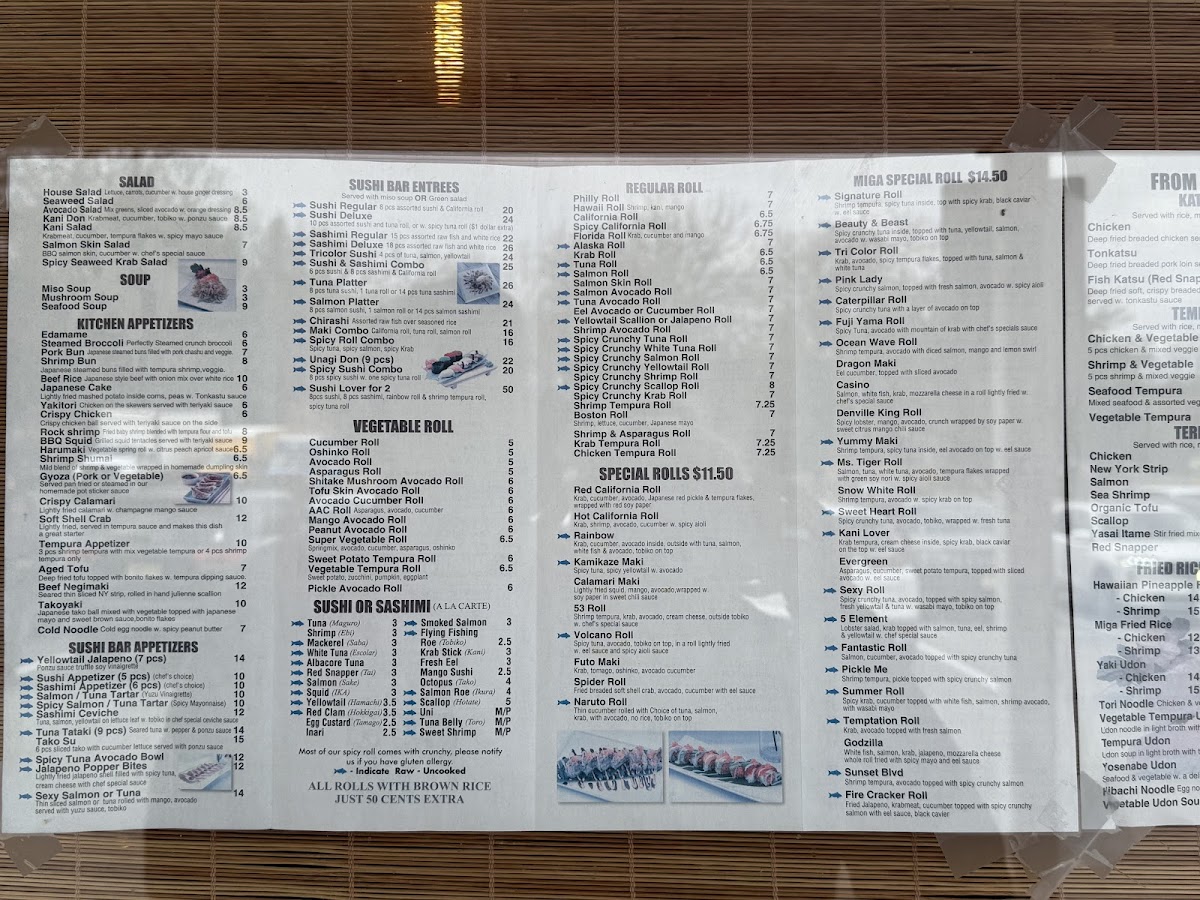 Crab, cucumber, avocado inside, outside with tuna, salmon, white fish and avocado.
